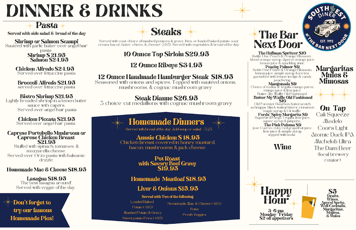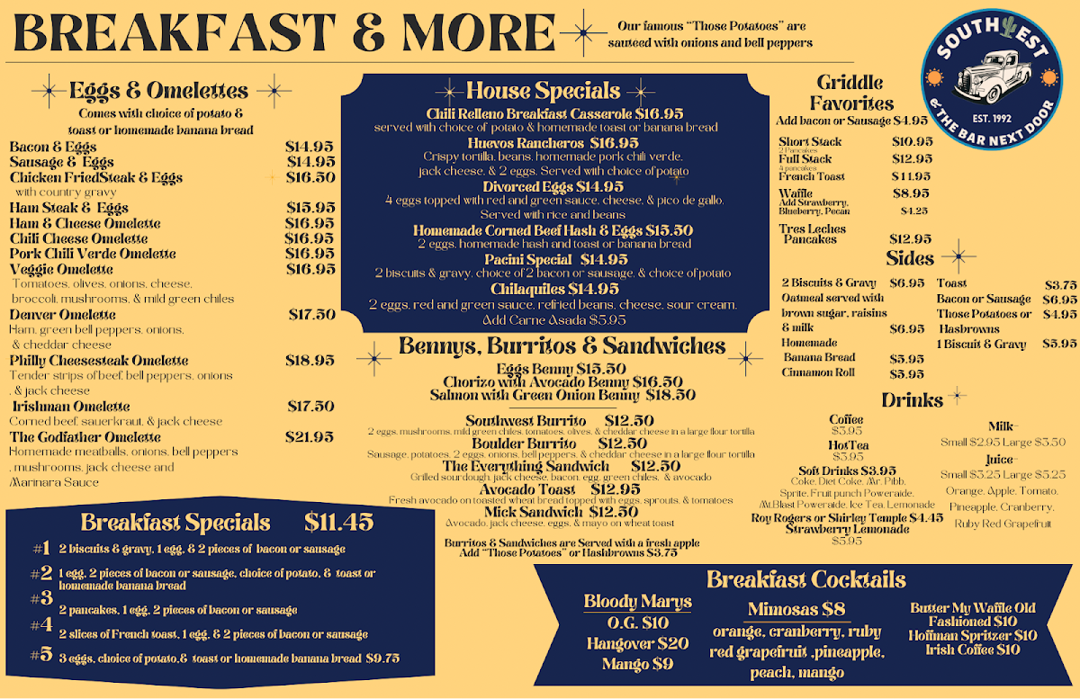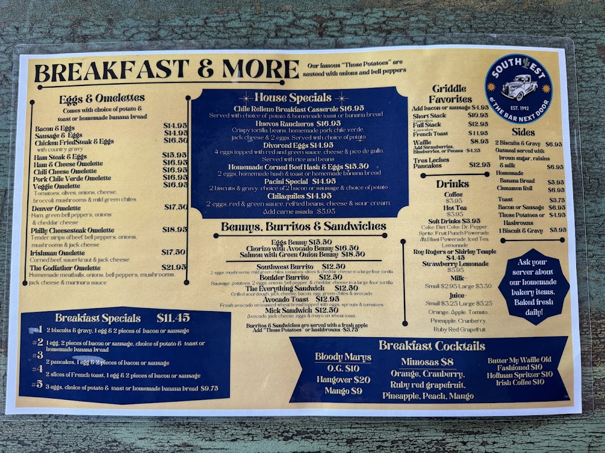 Step into the cozy charm of Southwest Diner, nestled at 761 Nevada Way, Boulder City, NV. This delightful diner invites you into a world where comfort food and friendly service are the star attractions. With an extensive menu that speaks to a variety of palates, Southwest Diner embodies the spirit of hearty American dining while offering some tantalizing Mexican dishes.