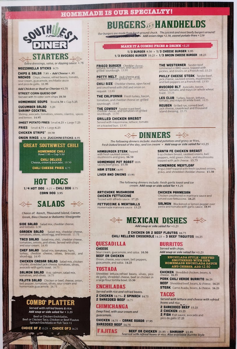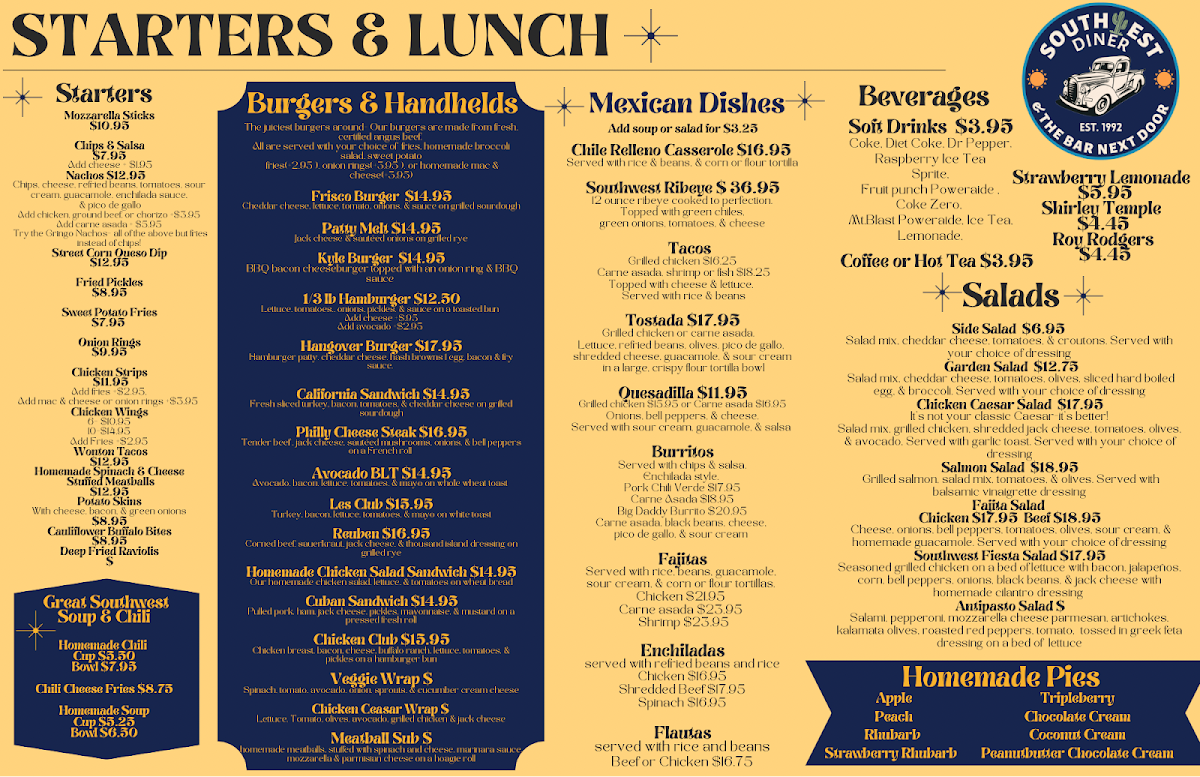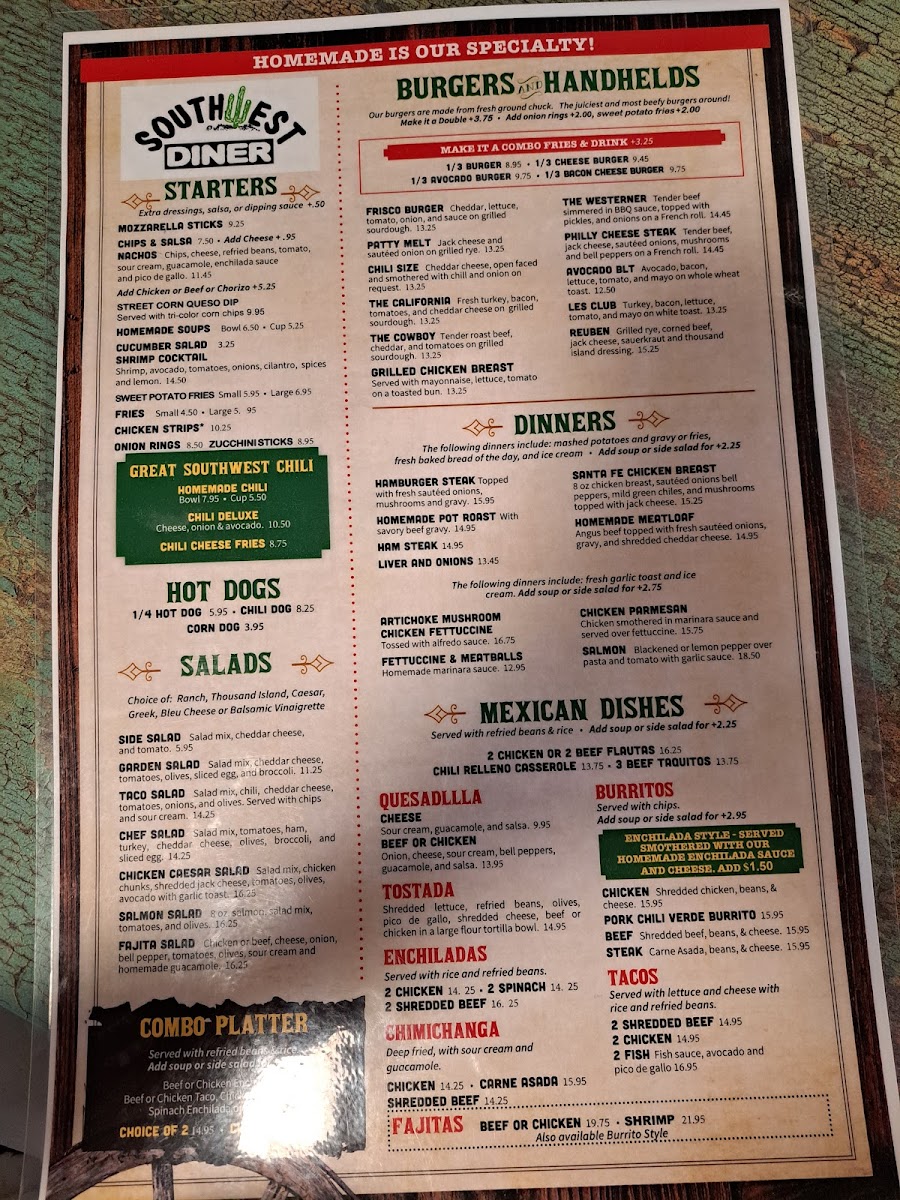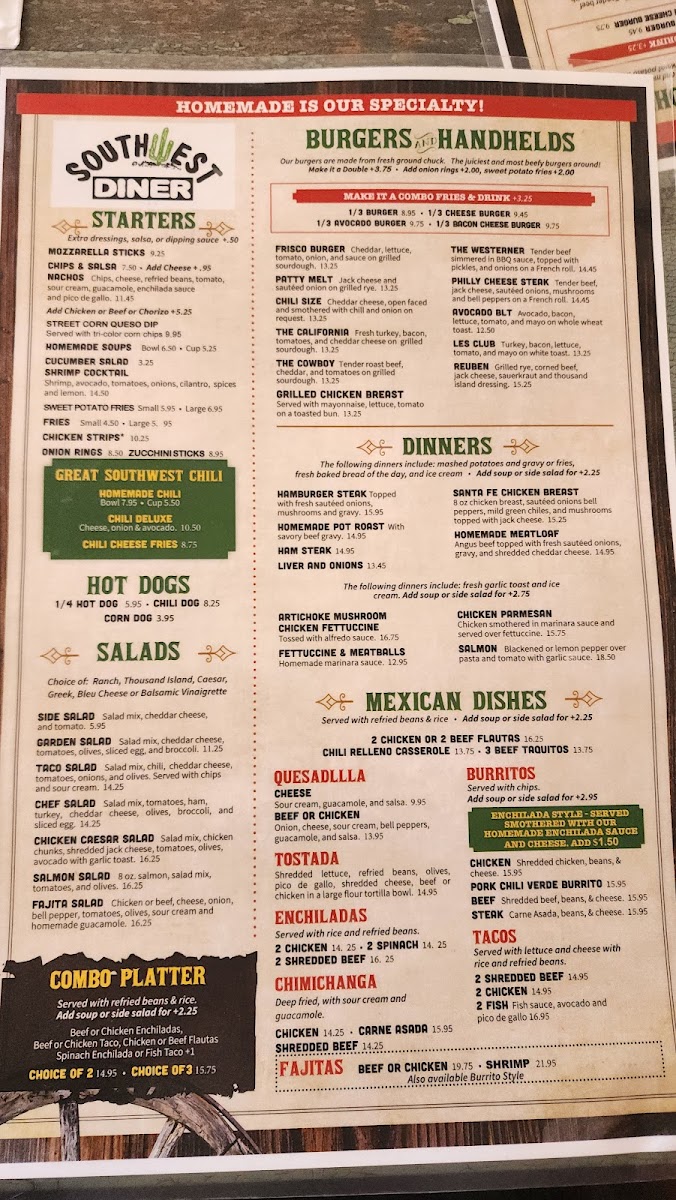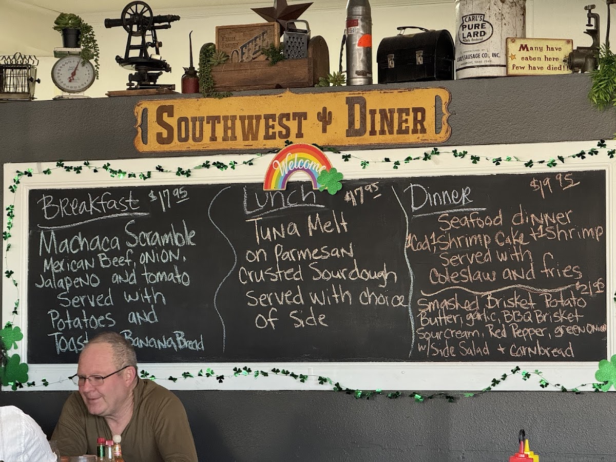 We had dinner at Southwest Diner on a Thursday night, and it was surprisingly quiet with no crowd. The service was friendly and the atmosphere was pleasant. The menu is very broad—offering everything from burgers and meatloaf to Mexican dishes—so it doesn’t really feel like they specialize in anything. The food itself was average—nothing bad, but nothing memorable either. We were also charged an extra fee for cheese on the cheeseburgers (just 30 cents), which seemed odd, but it wasn’t worth making an issue over. Overall, it’s a decent spot with good service, but the food is pretty basic.